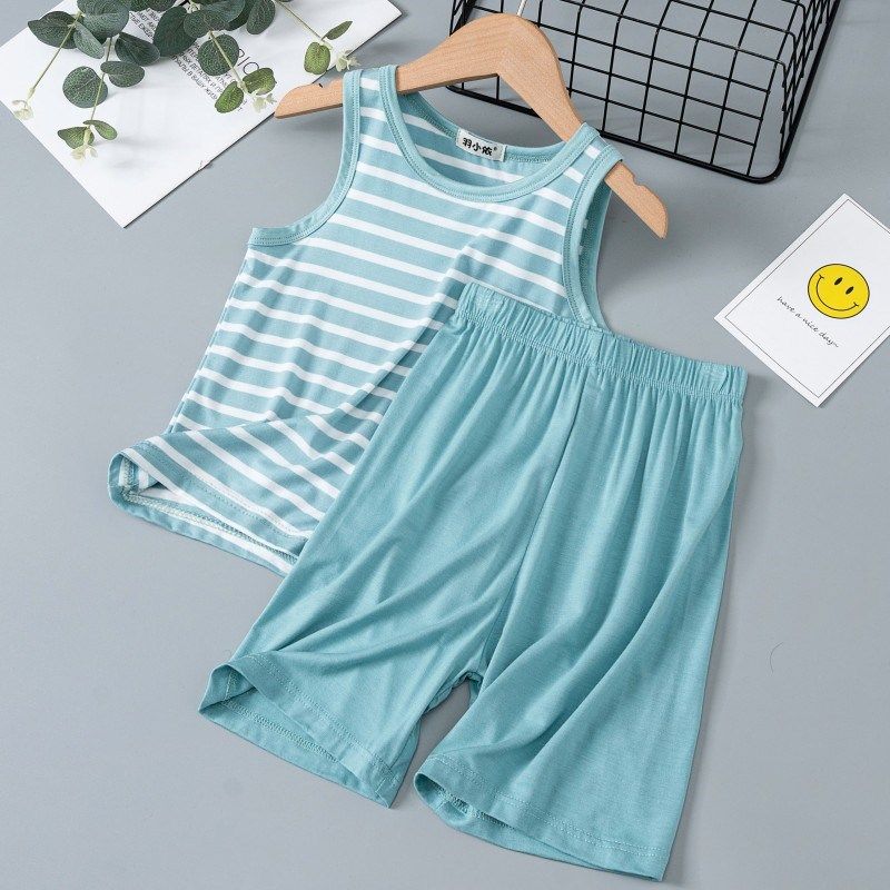儿童条纹背c心短裤两件套夏季男孩宽松无袖睡衣薄款女孩空调家居
