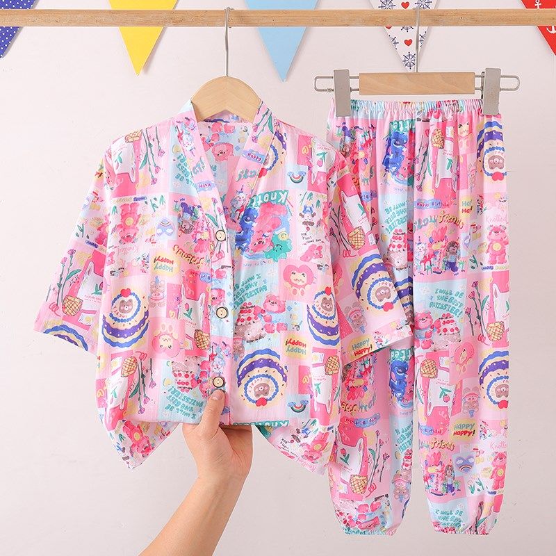 女孩夏季七分袖棉绸儿童睡衣薄款女童绵绸男童宝宝空调家居服套装