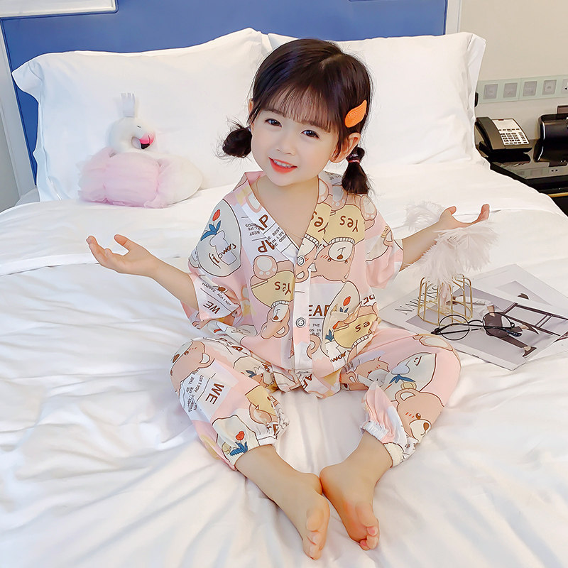儿童棉绸睡衣薄款女童小孩夏季天绵绸空调家居服中大童粉棕熊套装