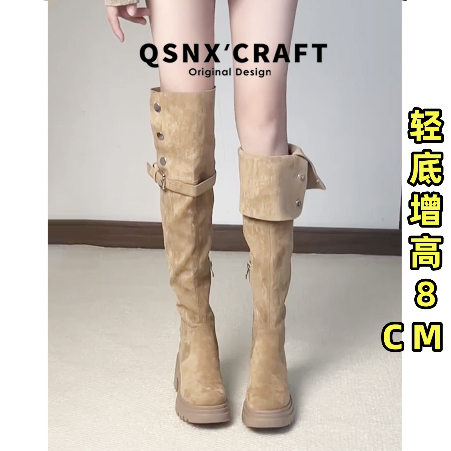 内增高过膝长筒靴女2025新款绒面高筒靴小个子靴子厚底卡其色长靴