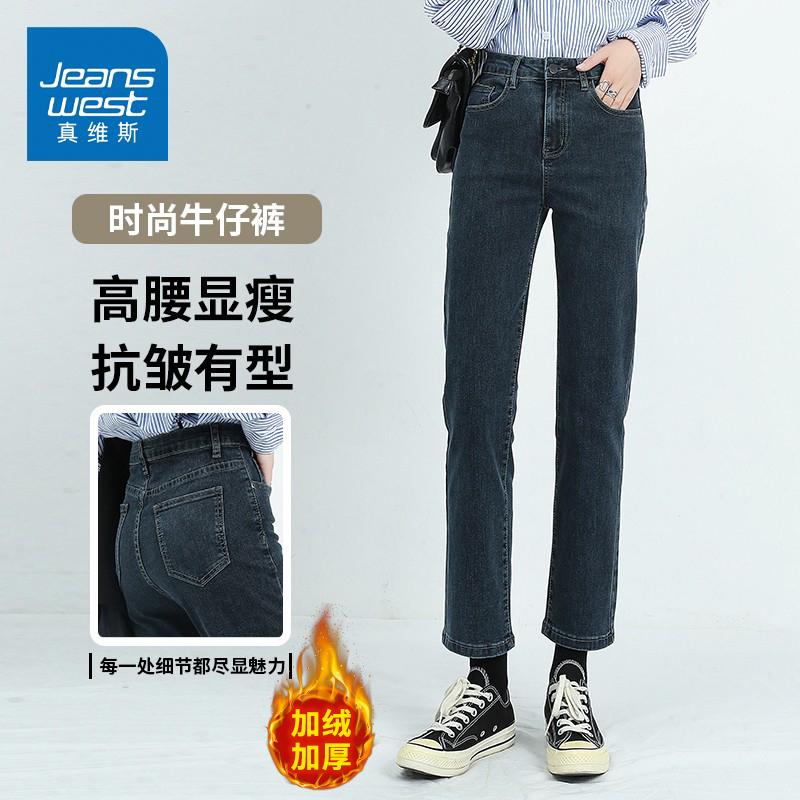 KZH真维斯直筒加绒牛仔裤女秋冬新款宽松九分裤小个子高腰烟管裤