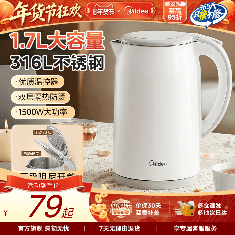 美的电热水壶316L不锈钢一体自动烧水壶煮开水保温家用大容量新款