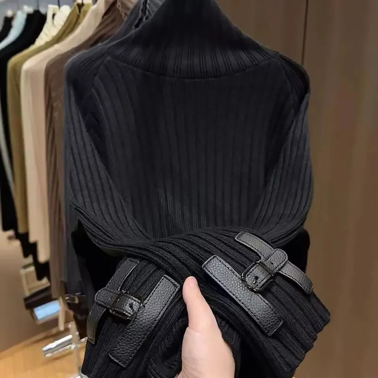 欧货2025秋冬季新款韩版宽松袖口重工皮扣高领毛衣女中长款打底衫