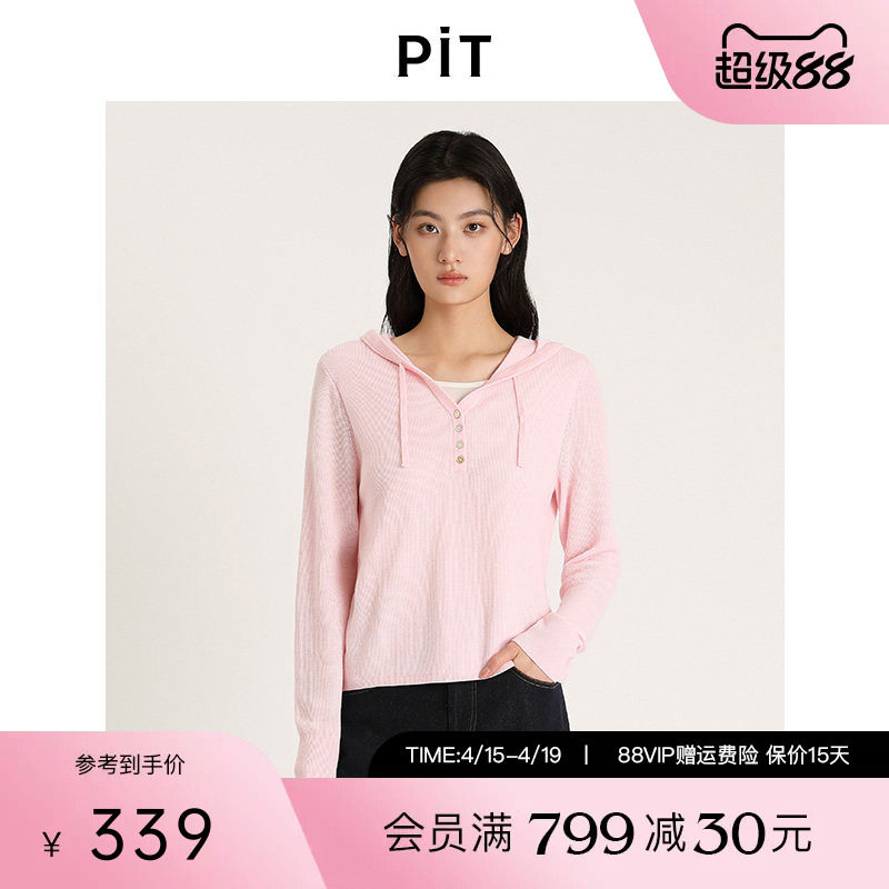 PIT粉色拼接假两件套头连帽长袖针织衫女2025夏休闲薄款上衣