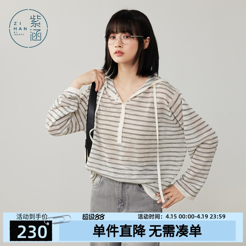 紫涵灰白条纹连帽长袖针织衫女秋季新款薄透宽松显瘦叠穿套头毛衣