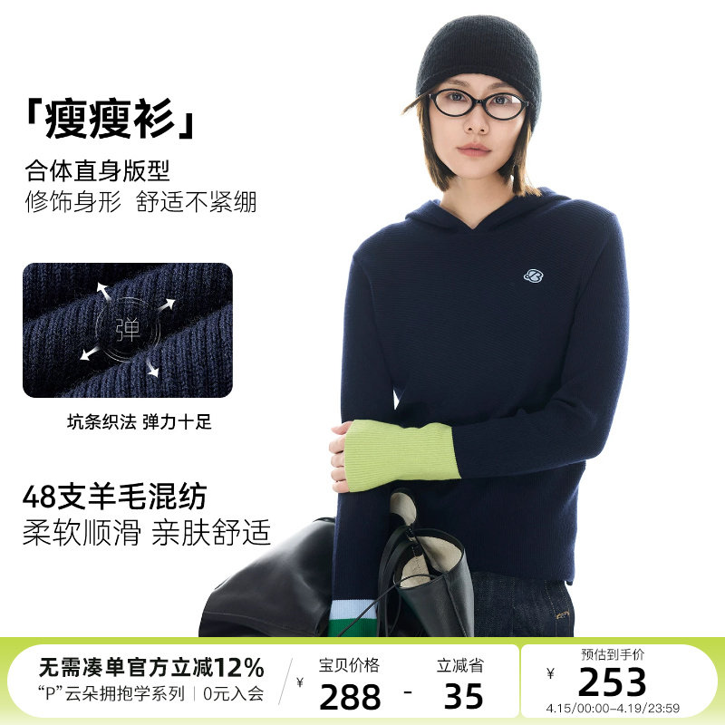 云上生活【瘦瘦衫】羊毛混纺袖口撞色连帽正肩针织衫套头衫上衣女