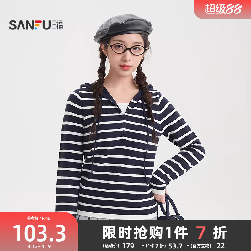 三福套头毛衣女2026新款春季假两件连帽针织衫条纹上衣女装515589