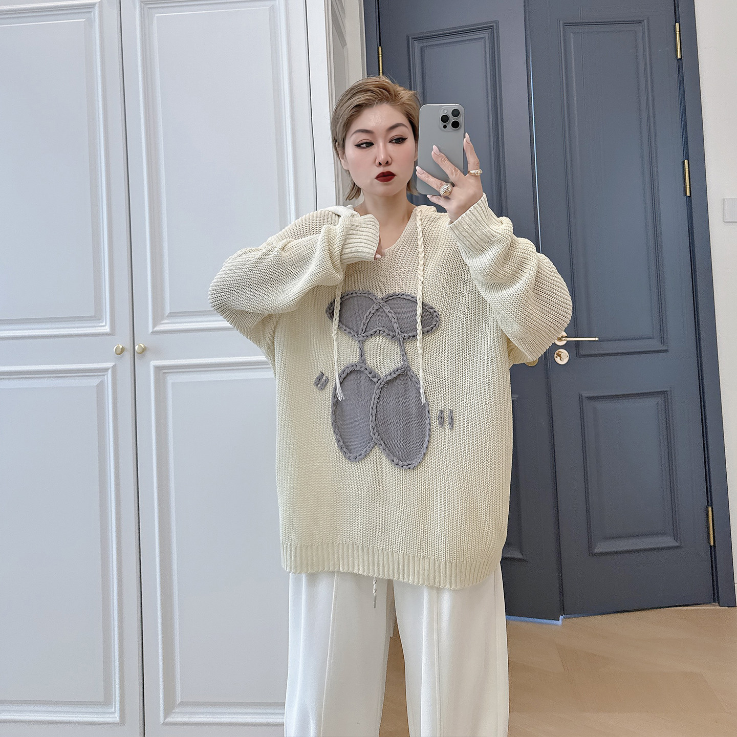 减龄提花连帽套头毛衫大码女装韩版宽松200斤胖mm慵懒风针织毛衣