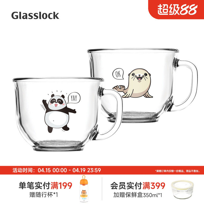 Glasslock卡通玻璃杯个性动物带把水杯果汁牛奶大容量家用早餐杯