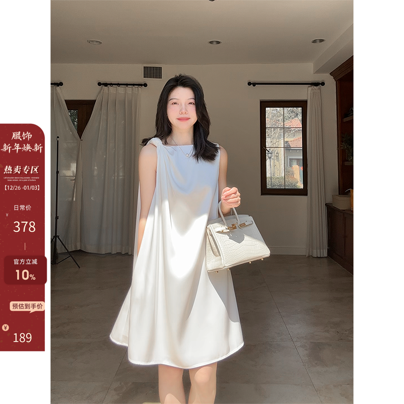 郭九九呢气质一字领扭结缎面宽松显瘦无袖背心连衣裙夏季简约裙子
