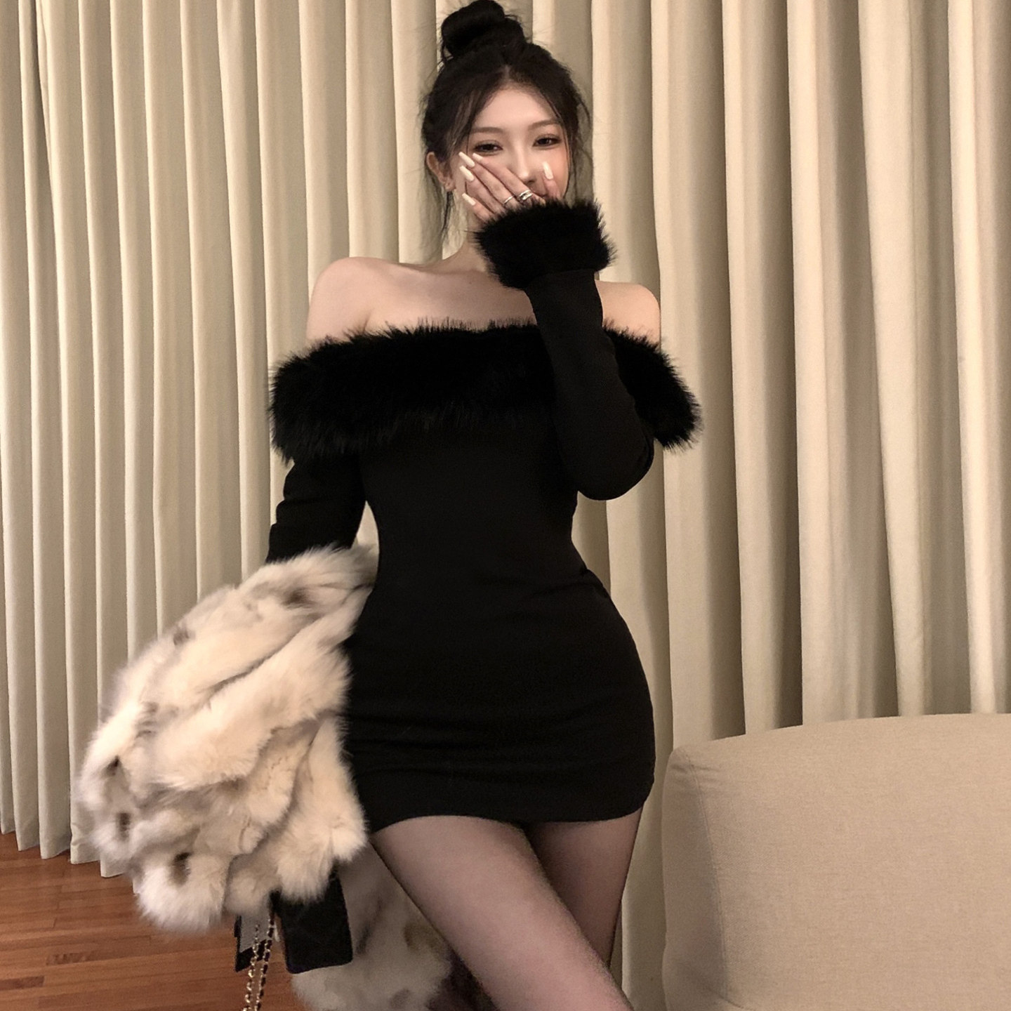 圣诞氛围感秋冬黑色辣妹毛毛领一字肩连衣裙女性感收腰显瘦包臀裙