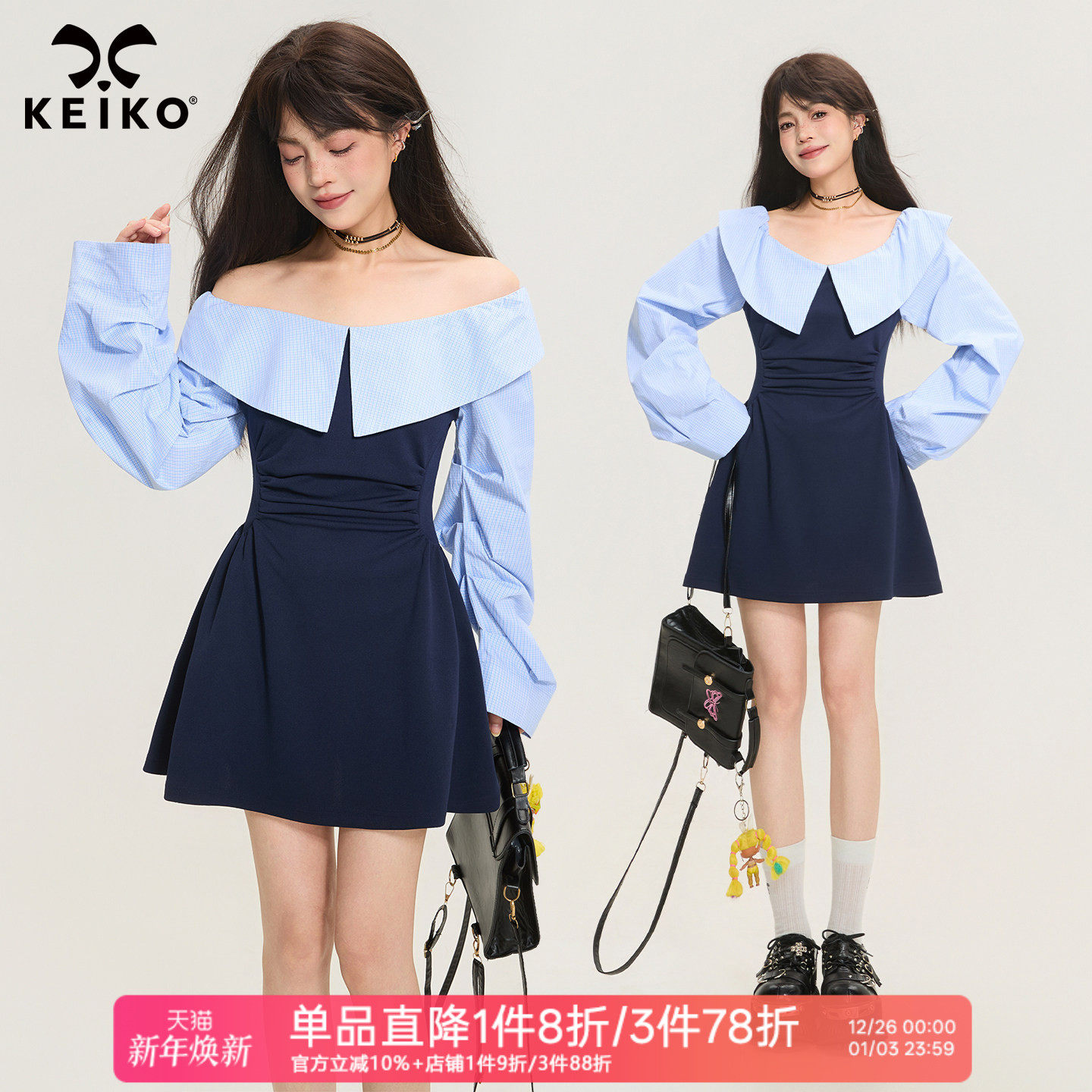 KEIKO 高智感拼色荷叶领连衣裙26春季法式一字领收腰显瘦a字裙