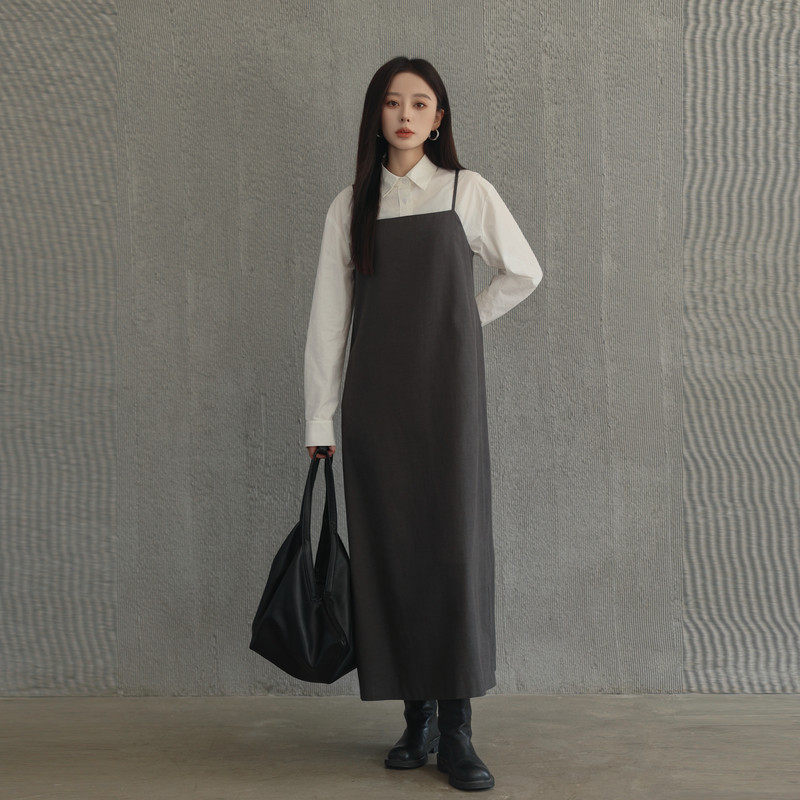 AIRIQI冬季新款极简通勤气质一字领显瘦吊带A字连衣裙女AY44LQ247
