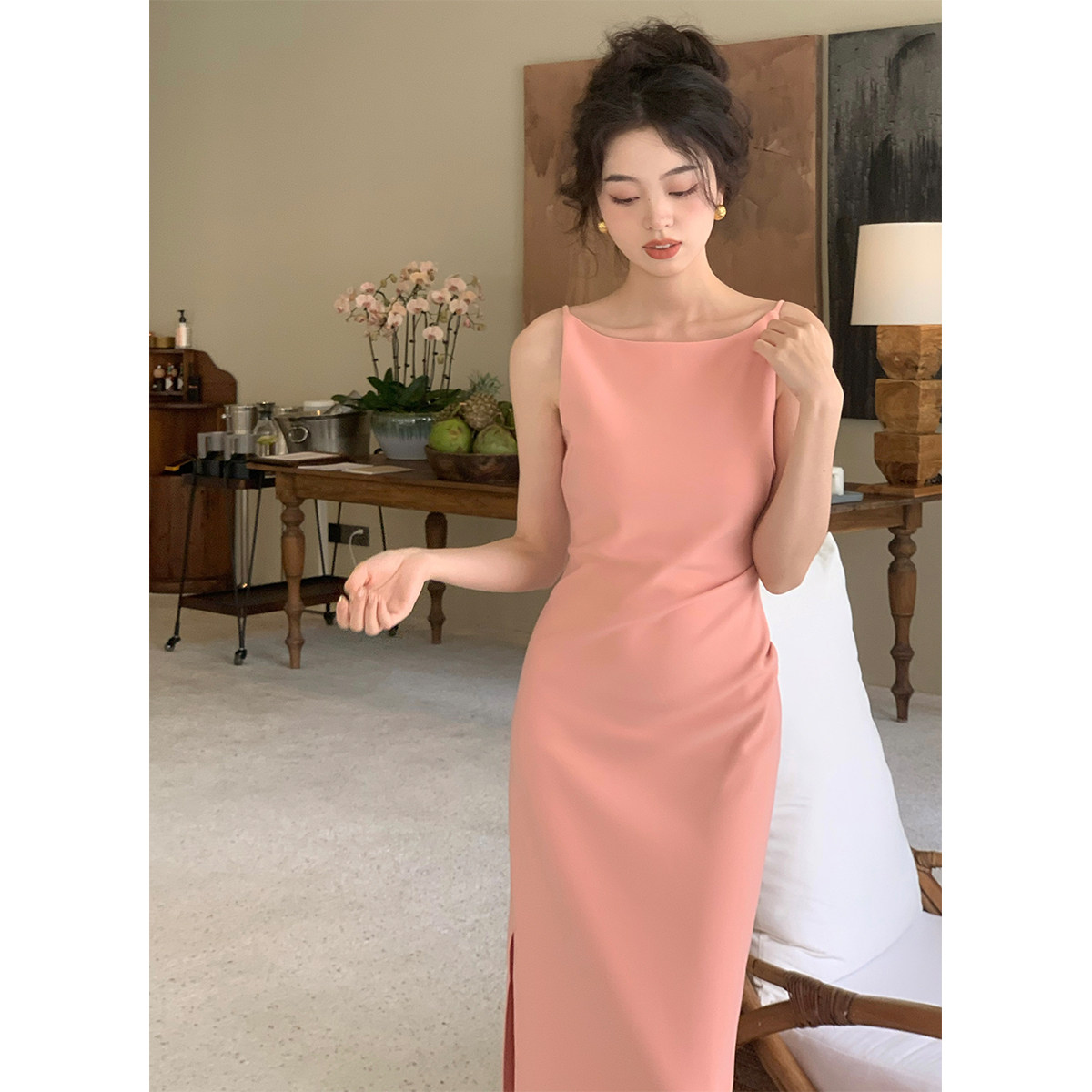 SYT经典肯豆 法式一字领收腰开衩连衣裙女高级感气质显瘦吊带裙子