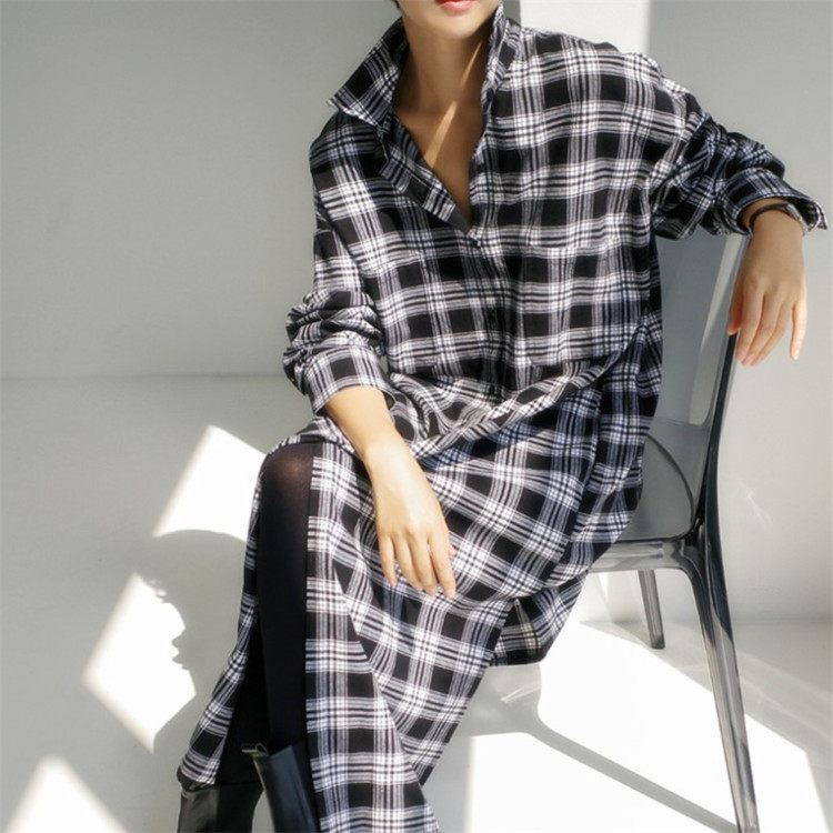 韩版宽松大码长袖衬衫裙2022秋季新款格子测开叉衬衫连衣裙女