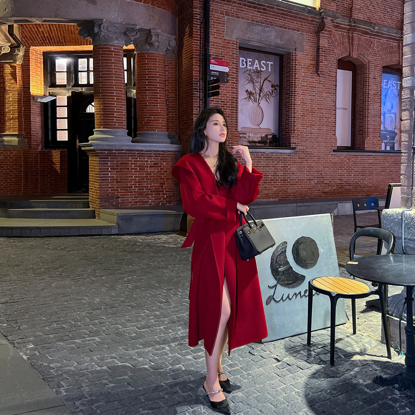 - 砖红色风衣女