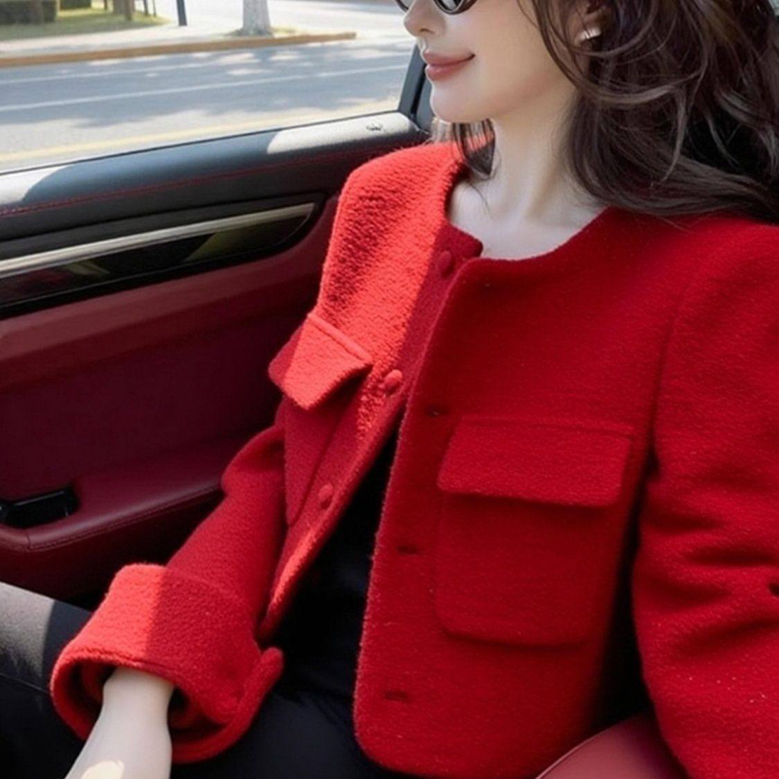 小香风2026新款韩版时尚气质百搭显瘦加棉女秋冬款红色羊毛呢外套