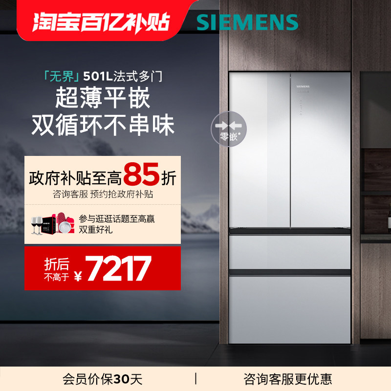 【玻璃面板】西门子无界501L平嵌零嵌法式多门双系统双循环冰箱