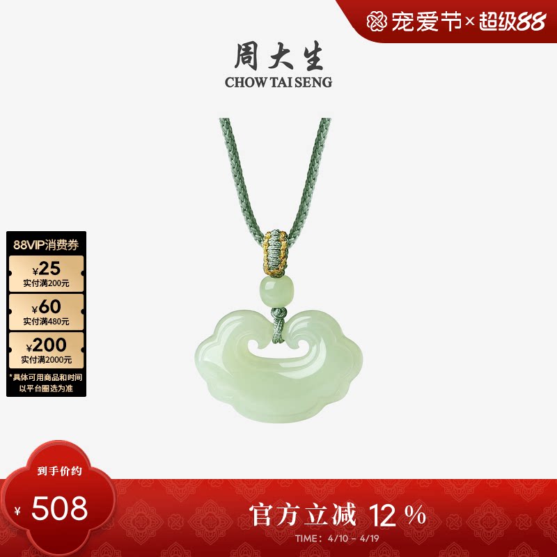 周大生和田玉吊坠女款如意平安锁玉挂坠项链编绳生日礼物送男女友