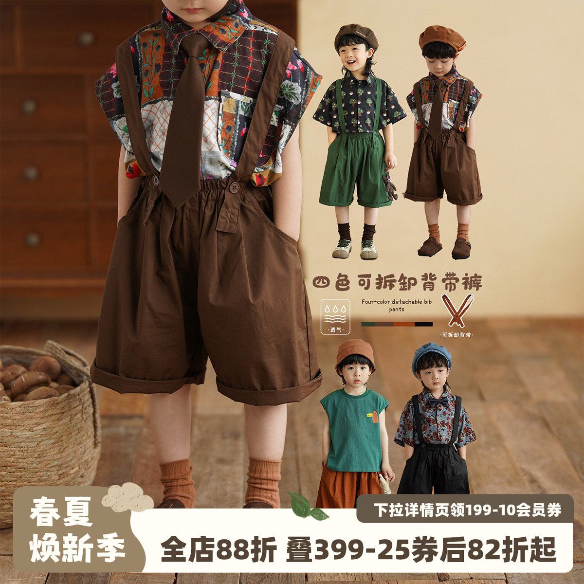 Oak Family夏季新品宝宝背带裤天丝亚麻休闲裤垂感文艺男女短裤