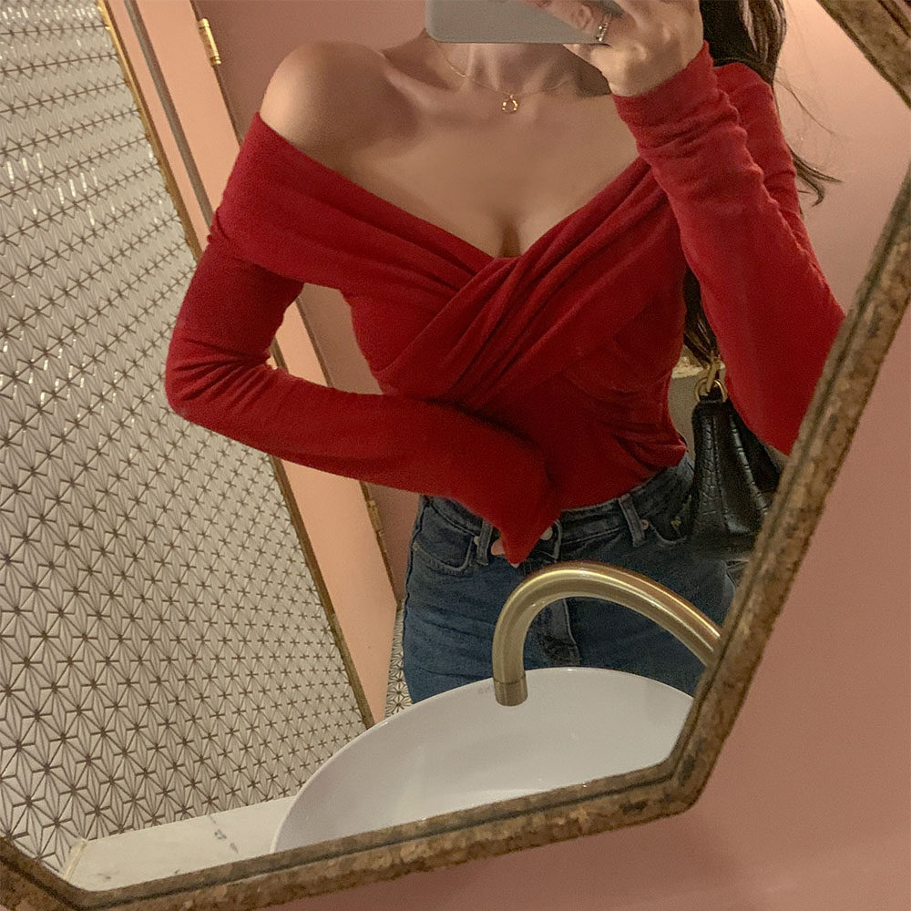 春季新款v领交叉修身显瘦性感漏背露肩一字领长袖t恤女打底上衣潮