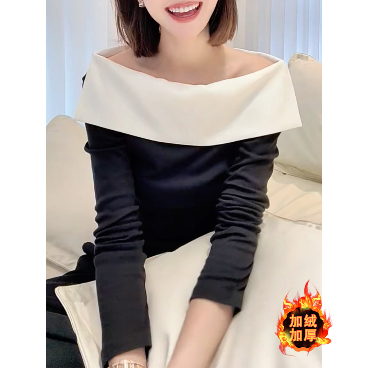 韩版撞色一字领露肩打底衫女长袖春秋季少女穿搭小衫黑色加绒上衣