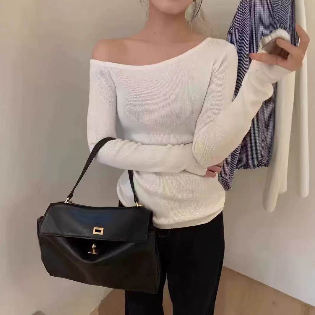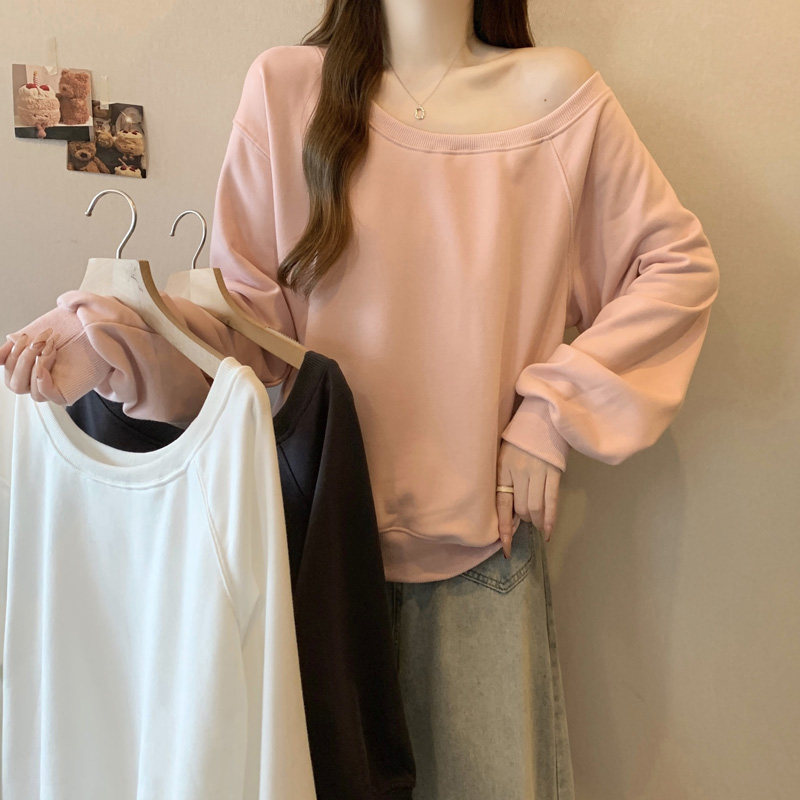 春秋清冷感韩版可露肩韩系百搭宽松休闲纯色一字领针织棉质上衣女