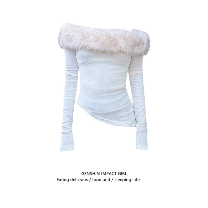 韩版时尚毛领一字领露肩长袖T恤秋冬新款甜辣妹修身显瘦百搭上衣