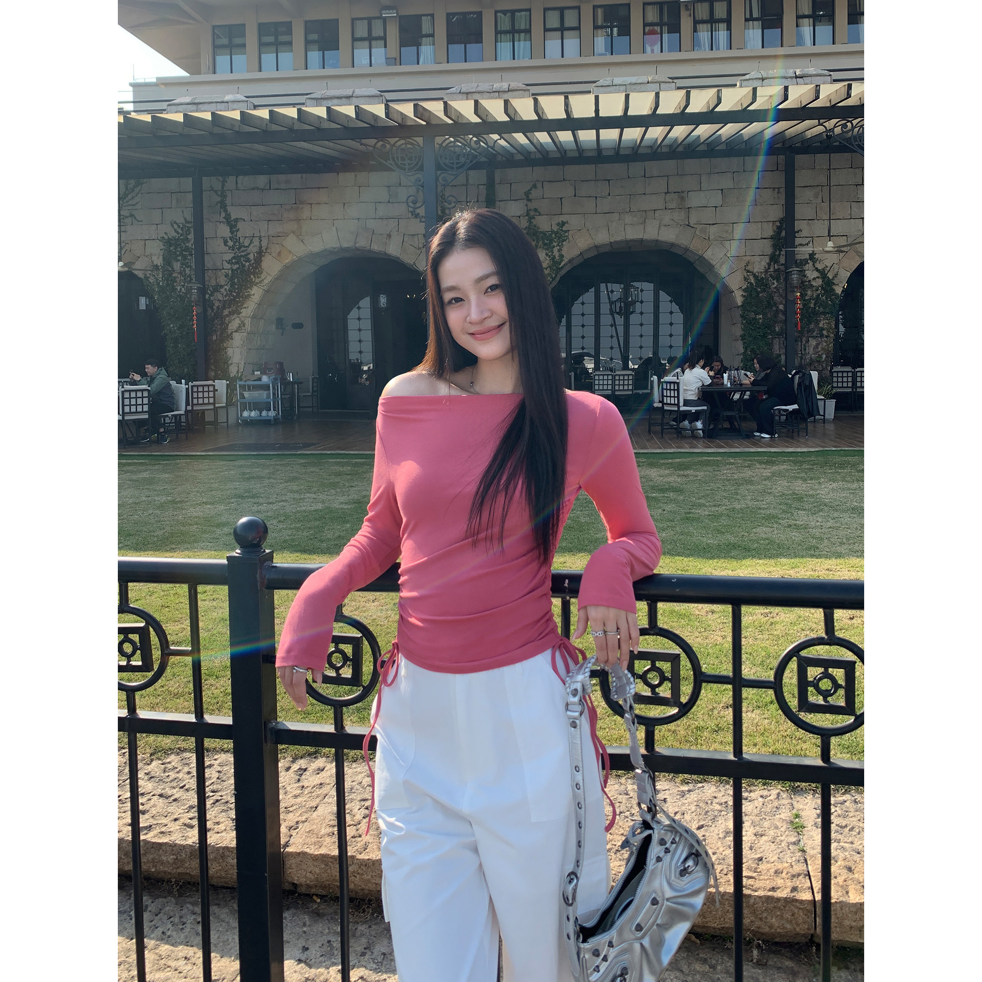 甜辣妹露肩一字领褶皱收腰长袖t恤女韩版不规则紧身显胸个性上衣