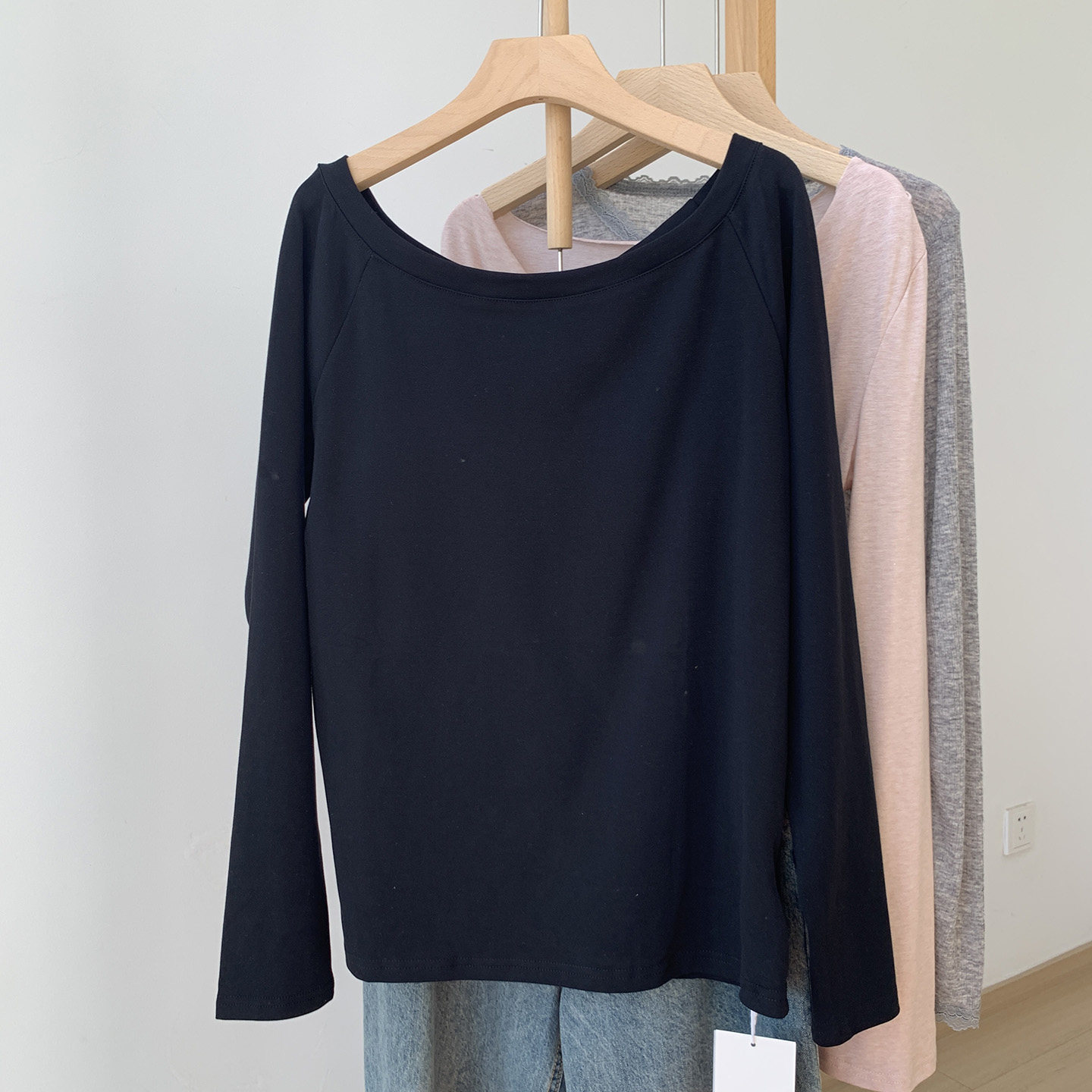 设计感小众一字领露肩长袖T恤女春秋宽松韩版内搭外穿打底衫上衣