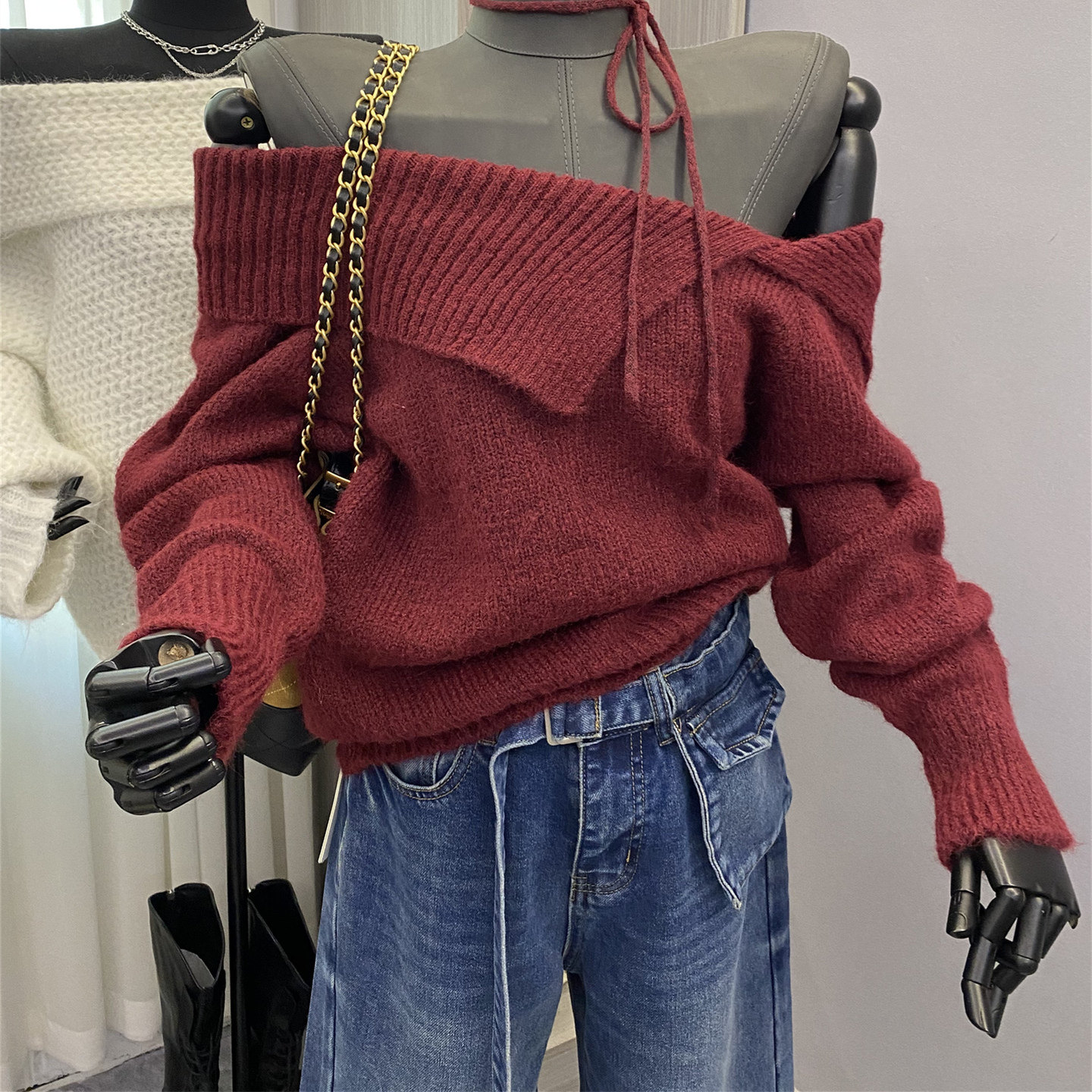 韩版新款纯色一字领露肩毛衣女纯欲慵懒宽松显瘦针织上衣配脖带潮