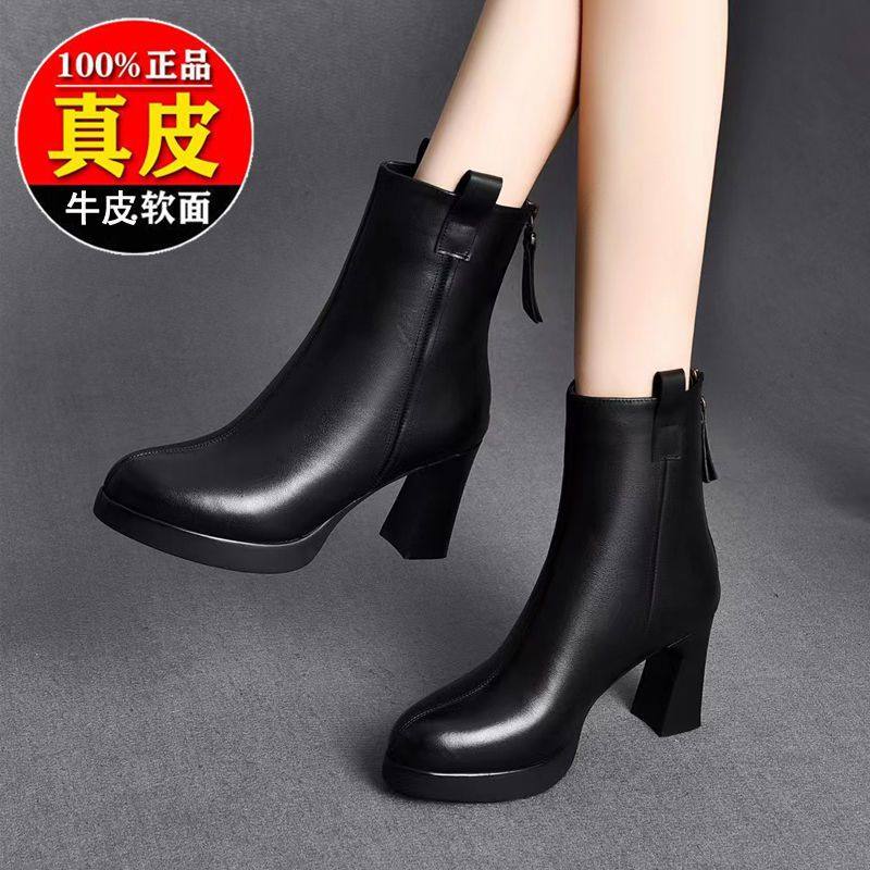 真皮高跟鞋短靴女2026秋冬季新款方头马丁靴黑色加绒粗跟瘦瘦靴子
