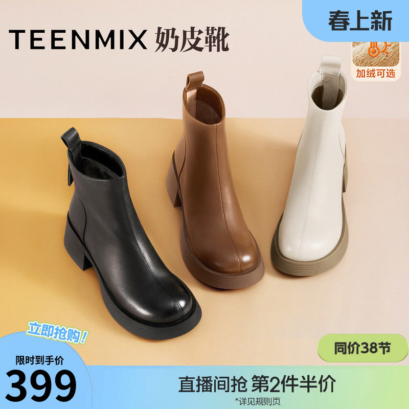 百丽班尼法式单靴春秋新款白色小短靴加绒瘦瘦靴高跟裸靴马丁靴子