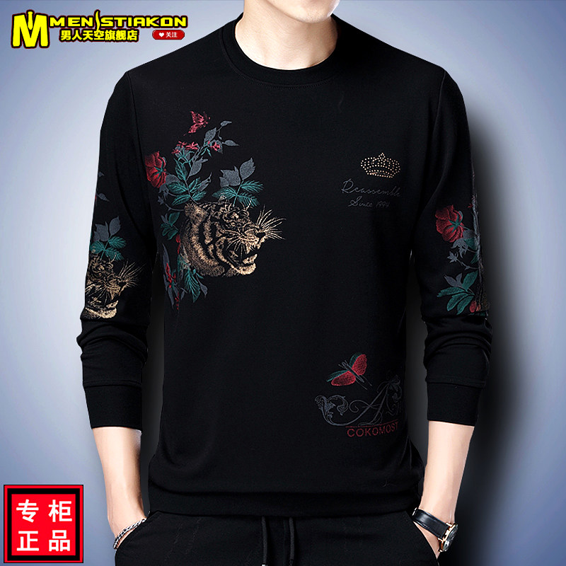 秋冬男士长袖印花t恤中年龙图案潮流宽松卫衣秋季加绒男体恤打底
