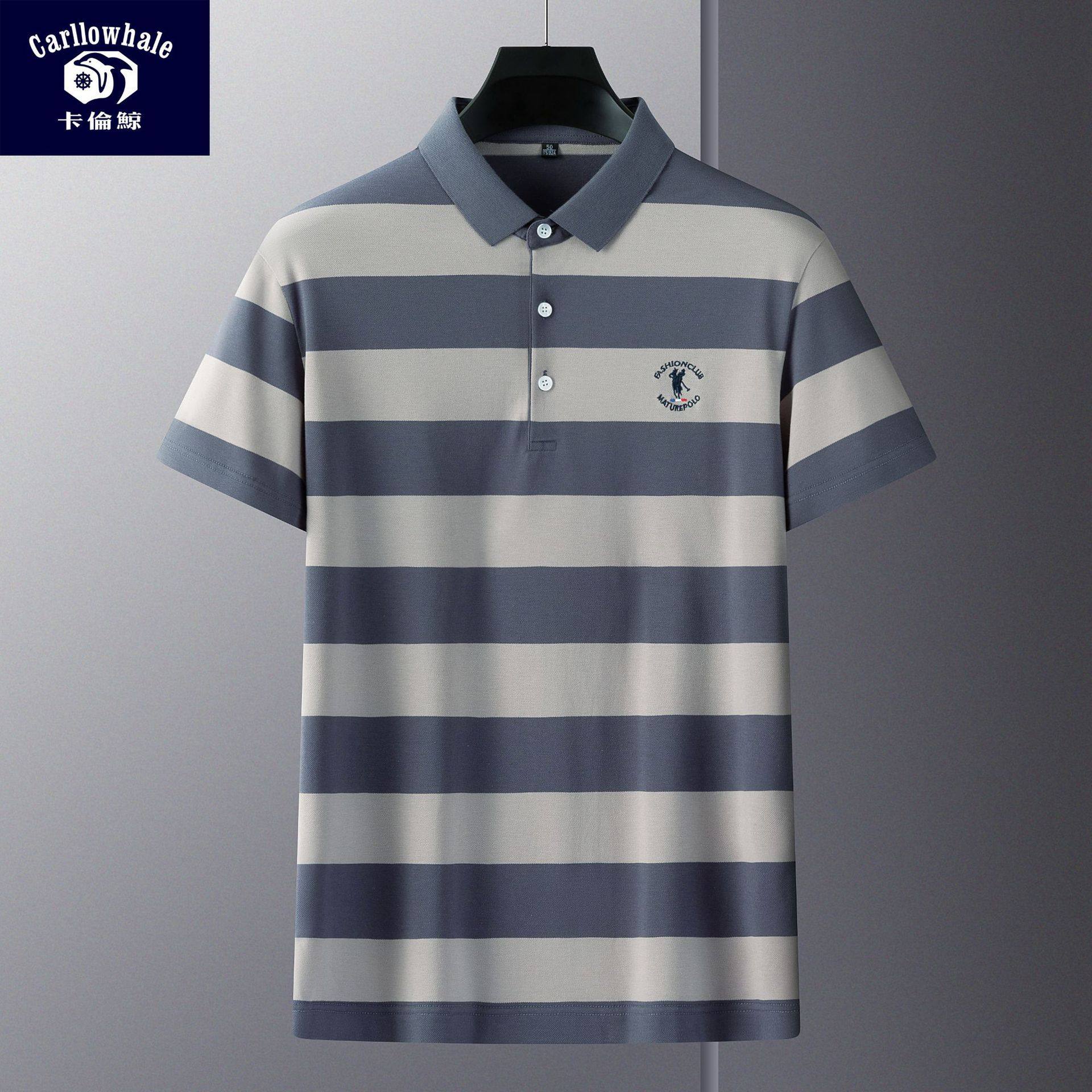 卡伦鲸男装纯棉男式短袖T恤衫中青年刺绣翻领宽条纹男体恤POLO衫