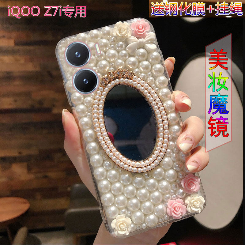 适用于iQOOZ7i手机壳全包边iQOO保护壳软硅胶iQOOZ7i带化妆镜子女款水钻外壳手机套