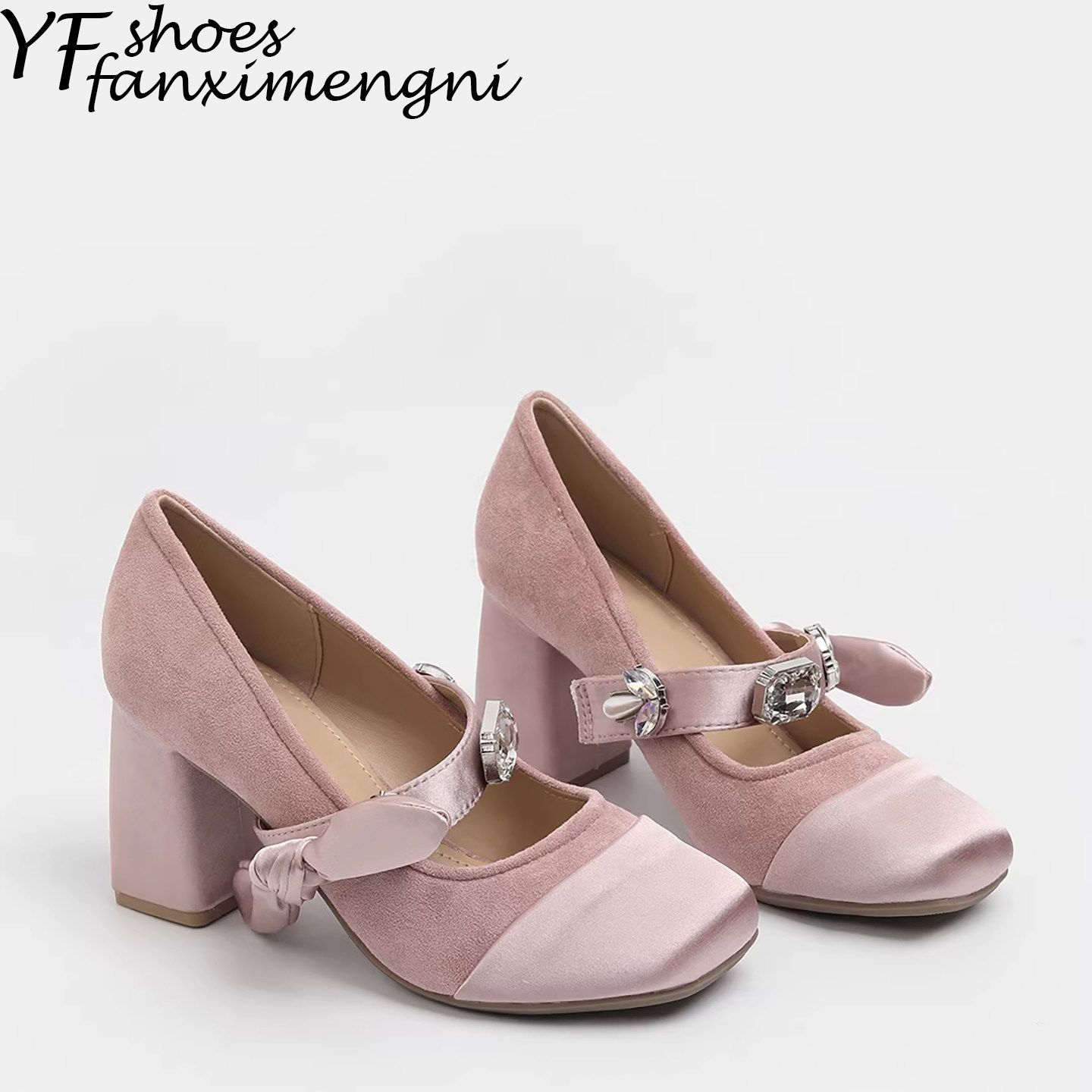 2026新款复古拼接绒面高跟单鞋女绸缎水钻一字扣带法式玛丽珍女鞋