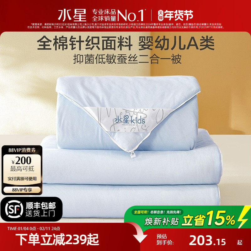 水星儿童蚕丝被100S长绒棉低敏桑蚕丝春秋被抑菌冬被二合一被秋冬