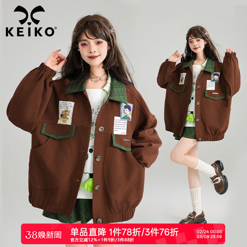 KEIKO 美式复古撞色翻领外套女2026春季文艺范宽松bf痞帅夹克潮