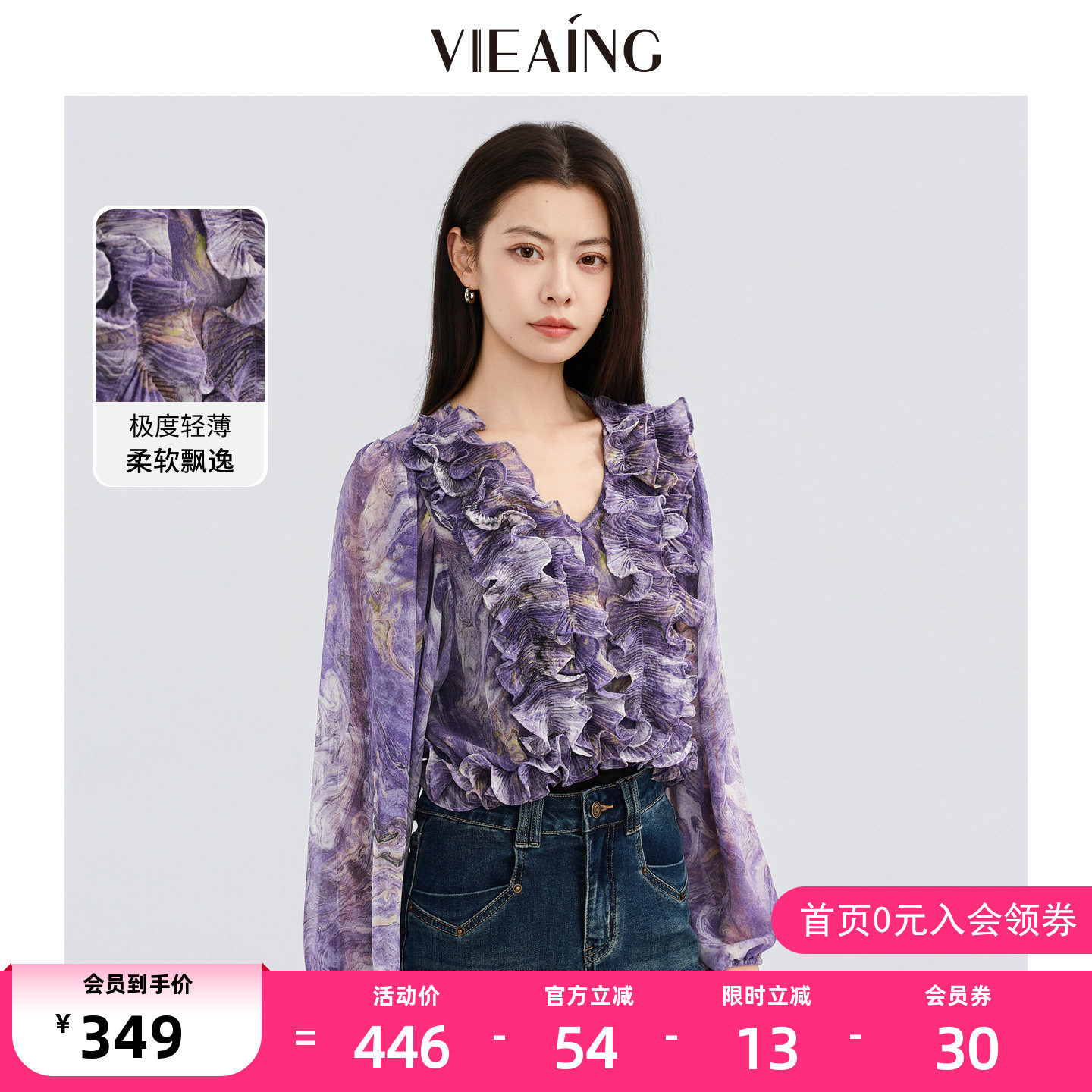 VIEA.ING薇迎商场同款木耳边衬衫女2026春季新款紫色小衫V领上衣