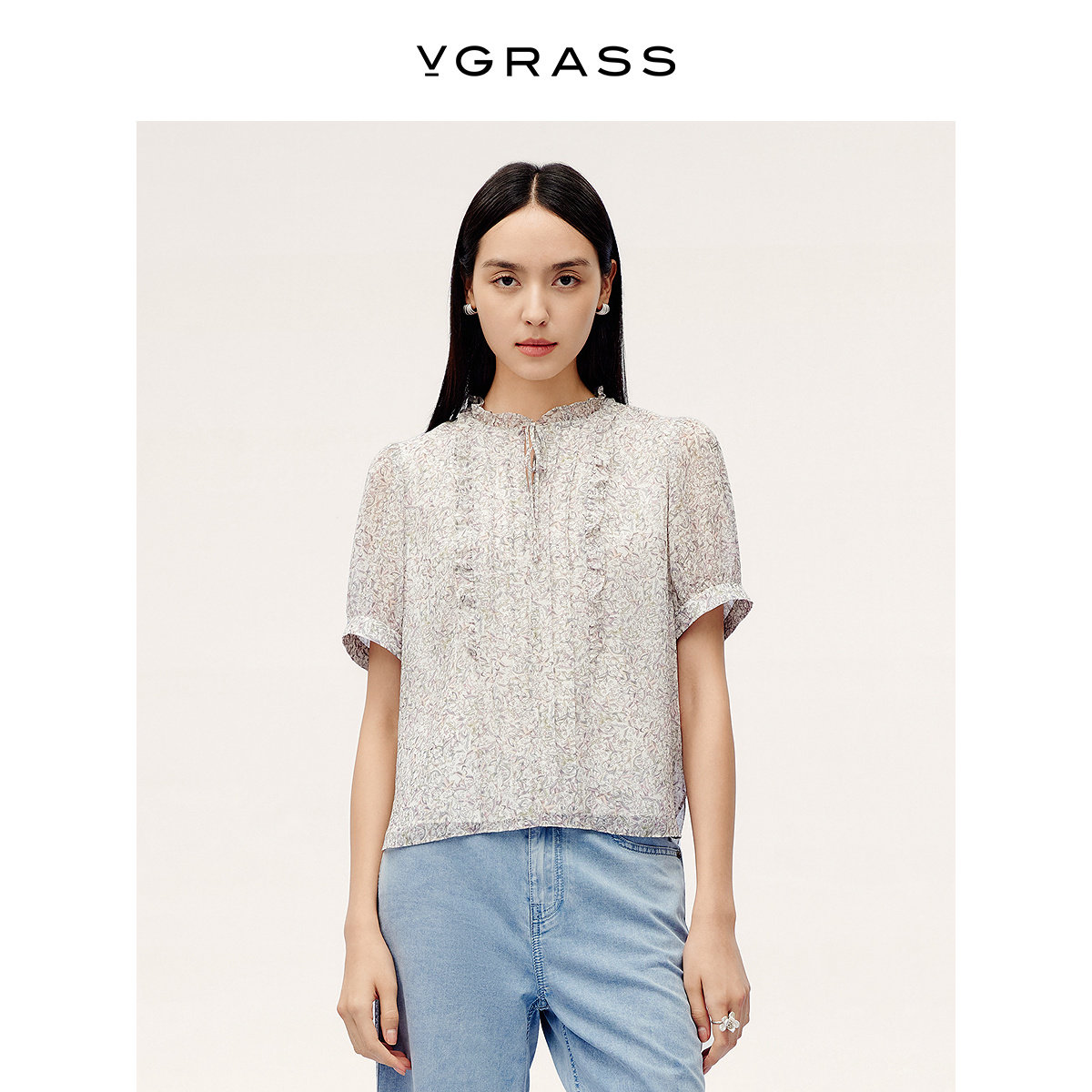 VGRASS维格娜丝夏季仿乔其贴身舒适精致定位印花短袖木耳边衬衫女