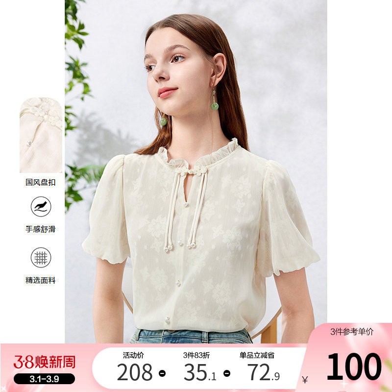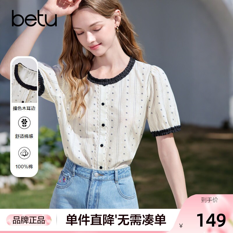 betu百图新中式国风木耳边衬衫女2025年夏季新款灯笼袖盘扣衬衣