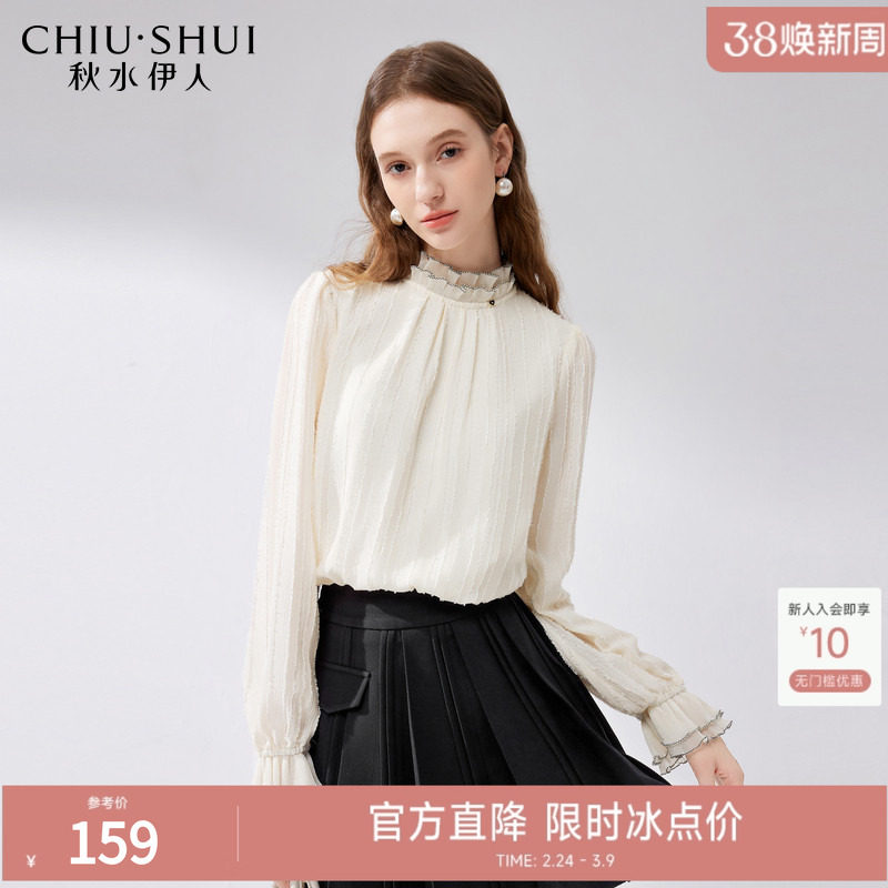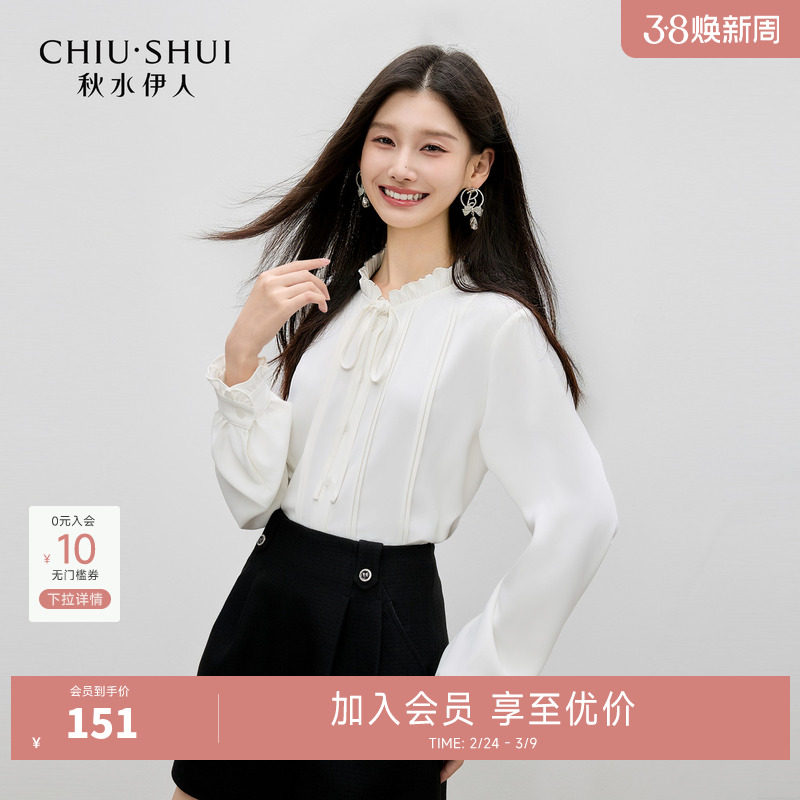 秋水伊人优雅木耳边衬衫女2026春装新款时尚立领压褶设计浪漫上衣