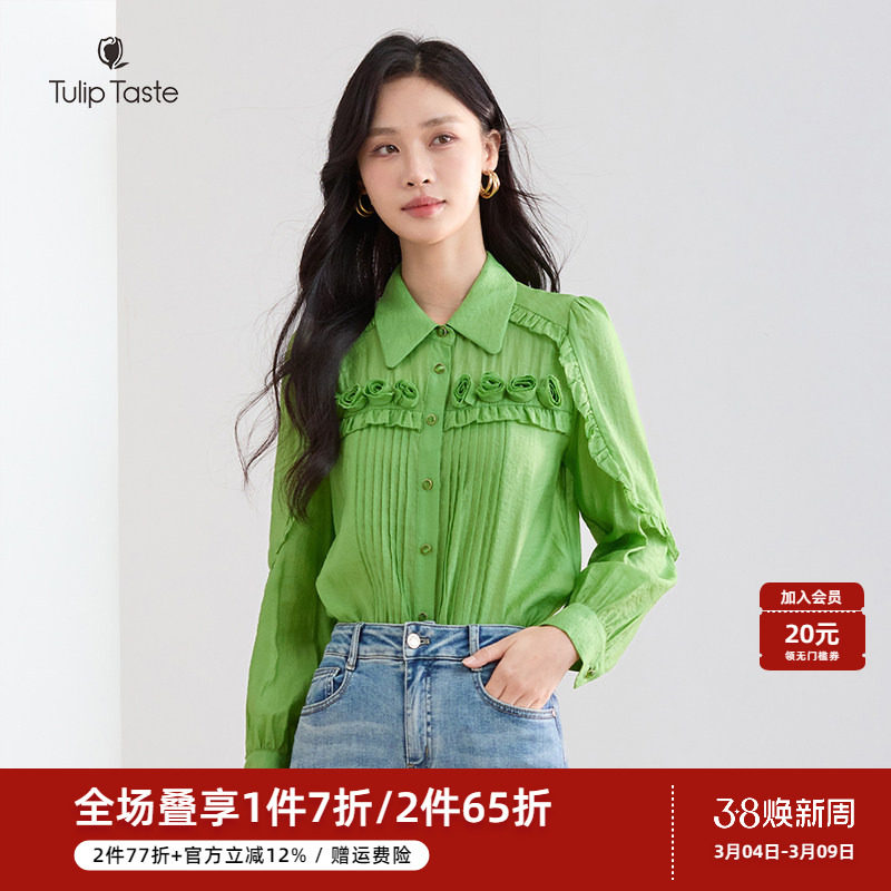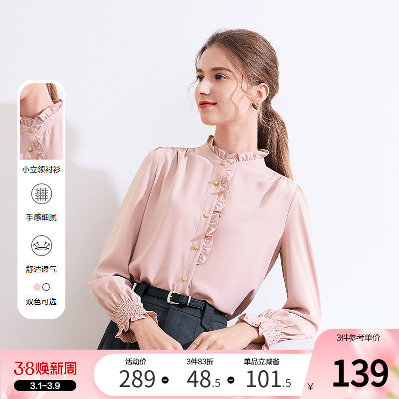 【商场同款】糖力春秋季长袖立领木耳边衬衫女轻薄款纱质衬衣上衣