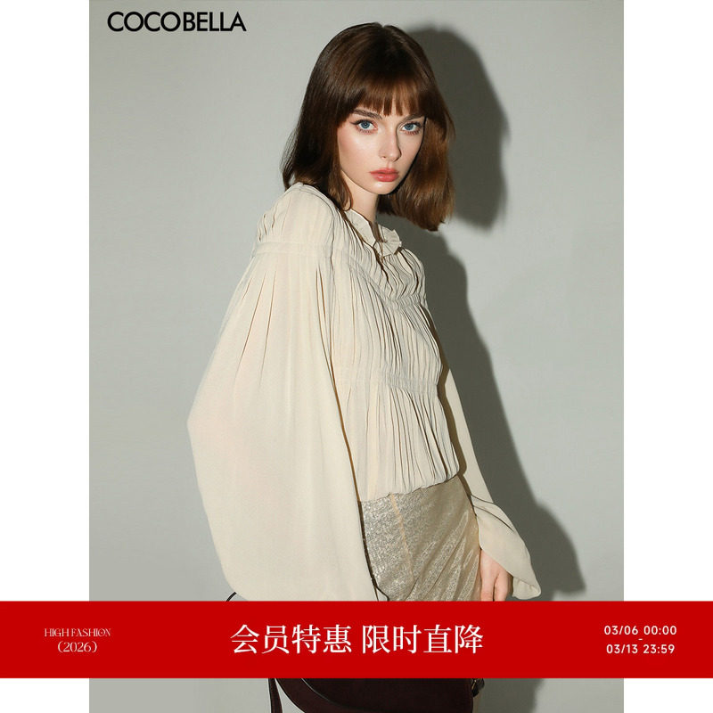 COCOBELLA气质名媛风手工压褶木耳边衬衫女26春飘带衬衣SR7062-2