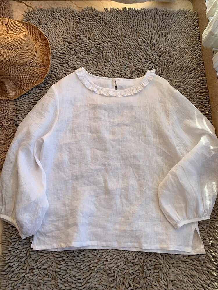 - 棉麻白衬衫女长袖翻领