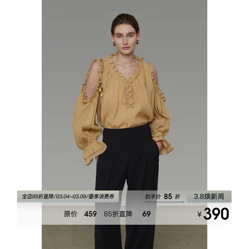 UNSPOKEN法式V领木耳边衬衫女春季宽松慵懒感气质泡泡袖露肩上衣