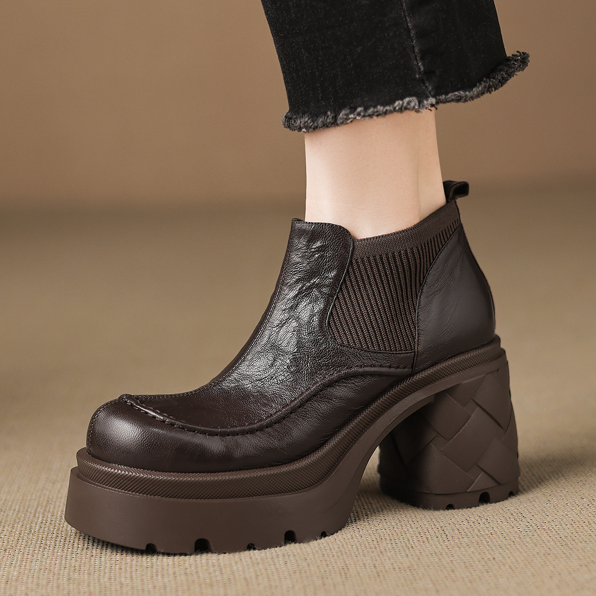 及裸靴高帮四季女鞋粗跟厚底靴子全真皮短筒马丁靴复古切尔西短靴
