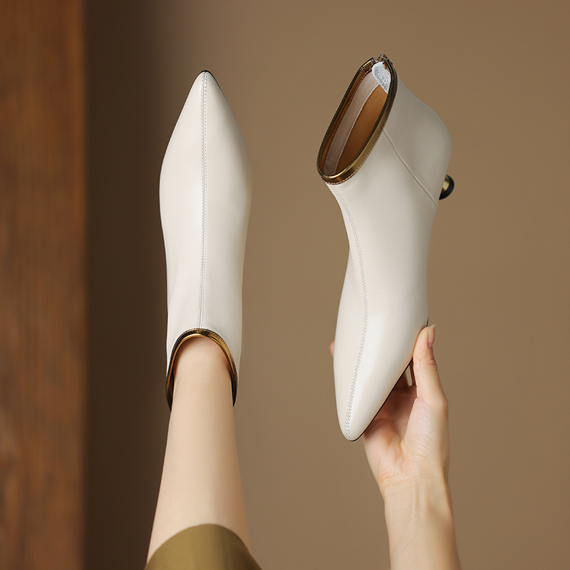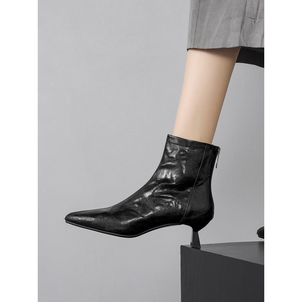 新款撤柜真皮牛皮女靴尖头时尚法式短靴百搭洋气后拉链靴子及裸靴