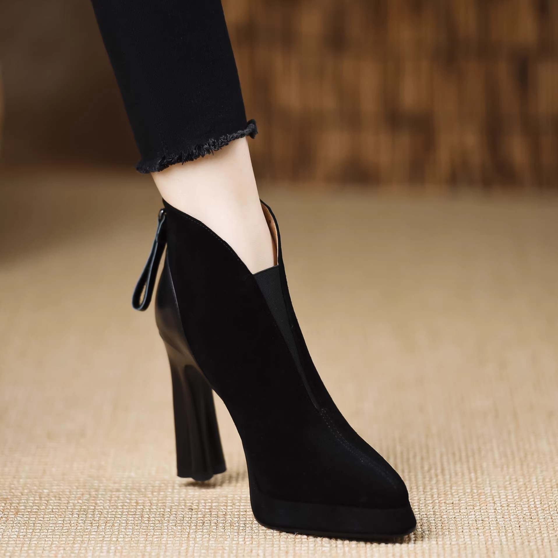 秋冬新款法式风尖头细跟高跟鞋短靴绒面瘦瘦靴及裸靴后拉链女靴子